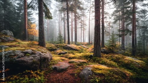 forest, tree, rock, moss, fog, grow, cover, racked, mystical, tranquil, natural, moody, lush, autumn, timberland, ground, path, landscape, pine, foliage, nature, scenery, background, decoration, environment, travel, tour tourism, adventure, exploration, stillness, wilderness, peace, quiet, serenity