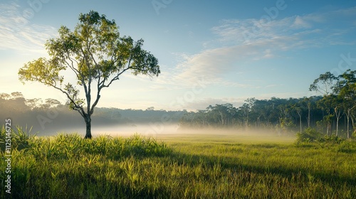forestry industry concept. Lush green landscape with a solitary tree under a bright sky and morning mist.