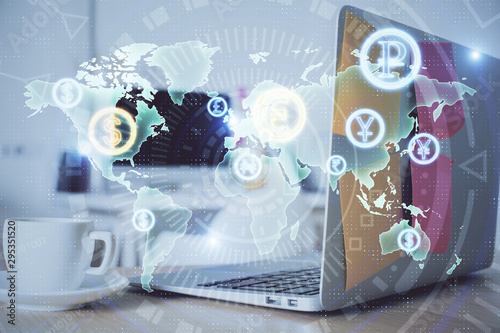 Forex market chart hologram and personal computer background. Double exposure. Concept of investment.