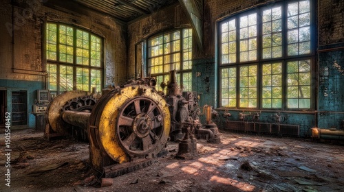 machine, factory, abandoned, ruin, industrial, decay, rust-eaten, old, engine, machinery, vintage, aged, time, forgotten, wreck, derelict, history, past, remnant, building, structure, interior, room, window, light, sunlight, shadow, dust, dirt, ground, floor, metal, iron, yellow, brown, green, blue, photo, image, still