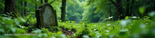 Forgotten, overgrown grave with crumbling headstone, decayed monument, overgrown burial site