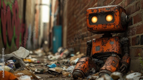robot, rust-eaten, homeless, abandoned, alley, street, urban, city, grunge, futuristic, machine, trash, garbage, lonely, brick wall, decay, discarded, derelict, broken, science fiction, neglected, mechanical, industrial, urban decay, future, forgotten, alleyway, robotic, metallic, worn-out, outcast, debris, technology, artificial intelligence, desolate, city life