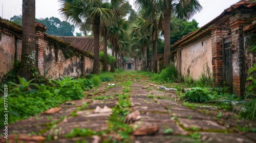 Forgotten Ruins A Palm-Lined Ancient Street in Decay, Historic Neglect, Overgrown Cobblestone, Abandoned Buildings, Tropical Architecture, Lost City, Nature Reclaiming, Time Capsule, Past Lives