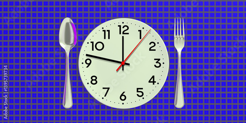 fork, spoon, clock, blue background, mealtime, metaphor, lunchtime, table setting, eating habits, modern style, crockery, graphic design, minute, concept, alarm, business, circle, dial