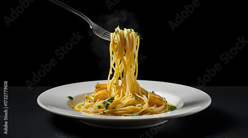 spaghetti, parsley, dark background, italian, dinner, minimal, copy space, steam, glossy, comfort food, classic, savour, pasta, food, plate, fork, sauce, meal, dish, tomatoes, cookery, white, cheese, basil, lunch, healthy, delicious, macaroni, eat, fresh, tasty, cooking, isolated, eatery