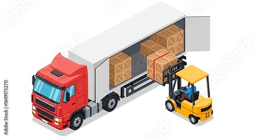 Forklift operator loading cargo boxes and wooden crates into a delivery truck. Industrial logistics, transportation, and supply chain concept.