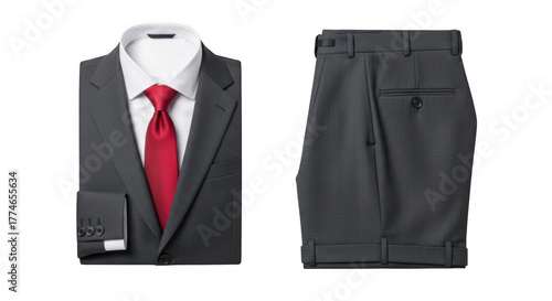 Formal dark gray suit jacket and pants with red tie isolated on transparent background