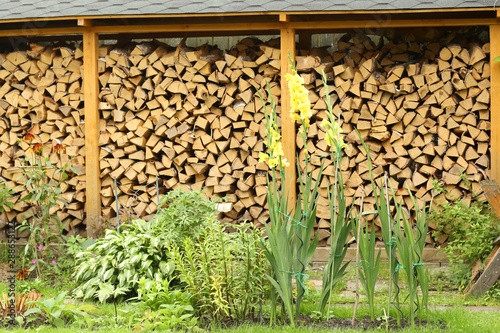 formal garden with hydrangea flowers, gladiolus, flox and wood store summer green photo