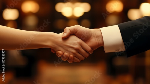 Formal Handshake in Warmly Lit Room, Two people in formal attire shaking hands in a warmly lit room