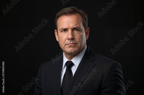Formal portrait of a serious businessman wearing a black suit and tie with a neutral expression against a dark background displaying professionalism and confidence.