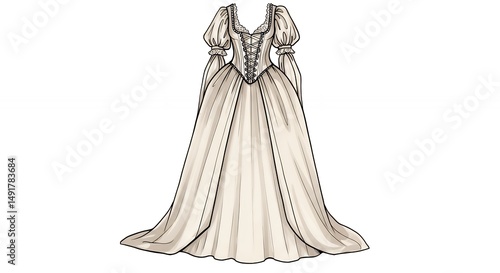 wedding, dress, gown, formal, fashion, illustration, design, drawing, vignetting, apparel, clothing, fashion design, vintage, style, elegant, luxury, silhouette, image, cream, grey, light, colours, isolated, digital illustration, bridal, robe, attire, front view, royals, sketching
