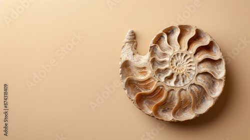 Fossilized ammonite shell with intricate spiral pattern on beige background