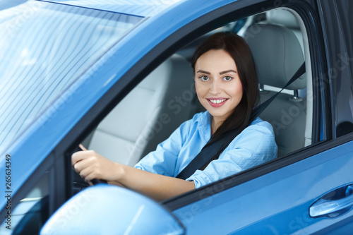 Found the perfect car. Beautiful cheerful woman smiling happily while sitting in her car