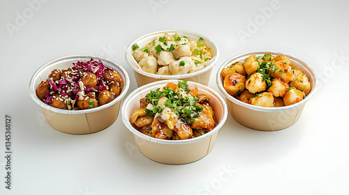 asian cuisine, asian cuisine, food, dish, bowl, chicken, pork meat, rice, vegetable, sesame seeds, sauce, plating, food photography, health food, dinner, lunch, catering, delivery, container, white background, closeup, isolated, studio shot, modern, contemporary, minimalist, light, bright, buffet, chinese food, japanese food, korean food