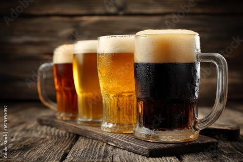 Four Beer Glasses with Foam on Wooden Board Varied Colors
