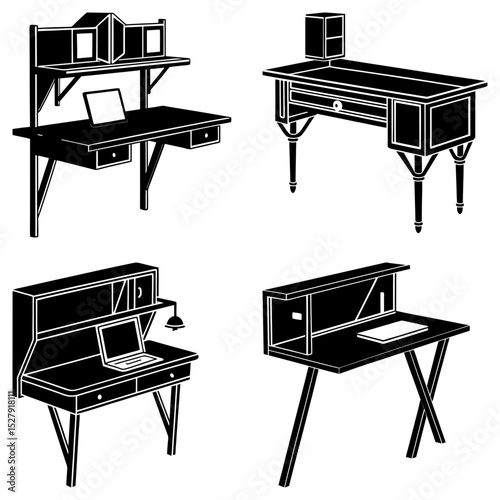 desk, furniture, illustration, black-and-white, design, office, study, work, table, computer, laptop, drawer, shelf, cabinet, lamp, wood, vintage, classic, modern, minimalist, home, interior, style, decorative, workspace, writing, drawing, vignetting, art, graphic, outline, icon, symbol, clip art, isolated, collection, set, variety, presentation, arrangement, display, structure, composition, element, object, domestic, equipment, stationary, organised