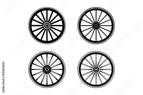 wheel, wheel, wagon wheel, spoked wheel, spoke, hub, rim, icon, icon, set, 4, collection, line art, outline, outlined, filled, graphic, simple, minimalist, flat, black-and-white, monochrome, vector, isolated, pictogram, clip art, variation, radial, circular, geometric, symmetric, grid, white background, design element, web design, symbol, illustration, vintage, retro, antique