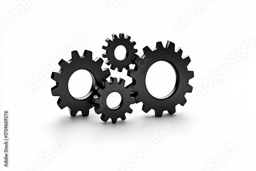 Four black interlocking gears of varying sizes on a white background symbolizing machinery and mechanical processes