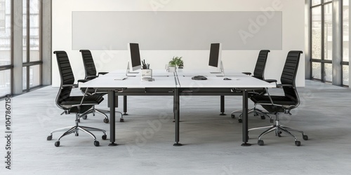 office, desk, chair, modern, workspace, furniture, interior, design, white, black, computer, monitor, contemporary, work, business, professional, collaboration, teamwork, meeting, technology, corporate, clean, minimal, style, ergonomic, comfortable, functional, efficiency, productivity, space, room, decor, floor, window, wall, light, bright, grey, empty, simple, open, organised, executive, office space, desk lamp