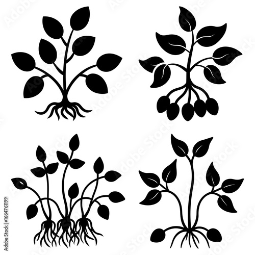 Four black plant illustrations with leaves and roots in a symmetrical arrangement on white background