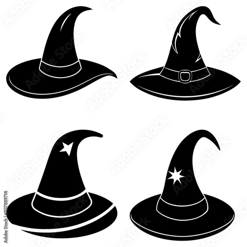 Four black witch hats with different designs including stars and a buckle on a white background image