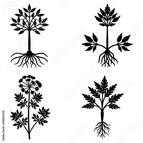 botanical, illustration, plant, root, leaf, black, white, tree, nature, flora, organic, tree branch, stem, growth, design, element, graphic, symbol, artwork, drawing, vintage, retro, art, decorative, pattern, silhouette, isolated, vector, herb, wildlife, natural, botany, foliage, garden, floral, image, clip art, icon, shape, artistic, simple, line, style, artform, creative, 4, illustration, showing, different
