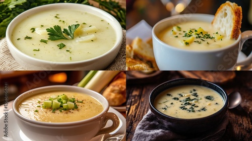 soup, potato, creamy, vegetable, food, culinary, cookery, delicious, healthy, meal, dinner, lunch, comfort, tasty, hot, bowl, plate, garnish, parsley, bread, crouton, leek, celery, kale, herb, spice, pepper, cooking, receipe, eatery, eat, drink, side, dish, smooth, texture, favor, aroma, fresh, organic, homemade, rustic, white, yellow, green, brown, collage