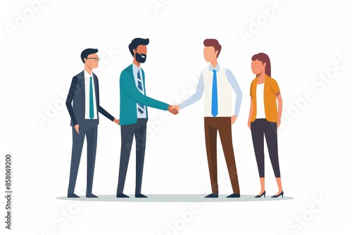 Four business professionals stand in a group, two men shaking hands, a symbol of collaboration and success.
