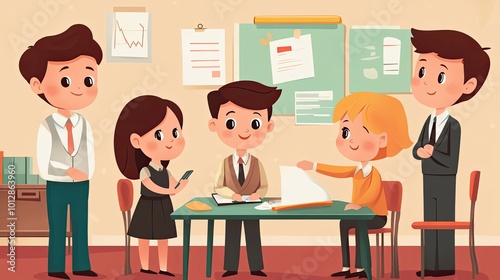 meeting, room, table, chair, desk, office, business, people, character, cartoon, man, woman, girl, boy, standing, sitting, working, document, paper, writing, talking, discussion, teamwork, collaboration, presentation, project, graph, chart, attaching, suit, vest, skirt, shirt, goggles, pen, folder, clipboard, whiteboard, note, wall, floor, brown, orange, green, white, black, red, yellow