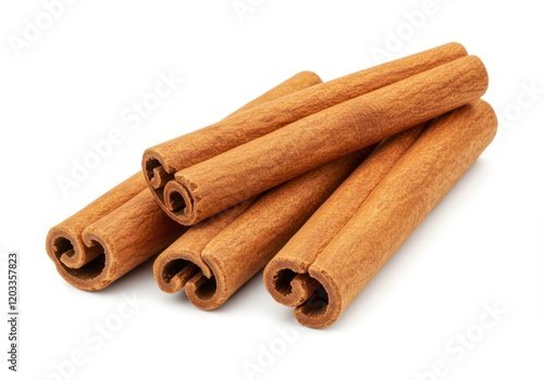 Four cinnamon sticks with a rough texture and hollow cores, arranged neatly isolated on a white background