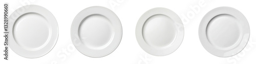 Four clean plain white ceramic plates evenly spaced on a bright minimalist background creating a balanced symmetrical composition