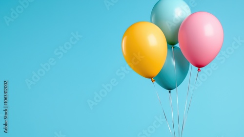 Four colorful balloons float against a bright blue background, creating a cheerful and festive atmosphere perfect for celebrations.
