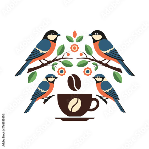 bird, bird, hot drink, cup, bean, bean, drink, beverage, caffeine, morning, breakfast, wake up, energy, aroma, roasted, dark, brown, blue, orange, white, green, leaf, tree branch, floral, flower, nature, wildlife, animal, illustration, graphic, design, art, simple, stylised, cute, decorative, pattern, symmetric, round, eye, beak, wing, tail, perched, sitting, creative, concept, icon, symbol