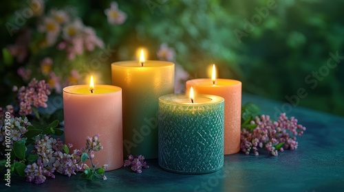 Four colorful candles glowing amidst flowers in a serene setting.
