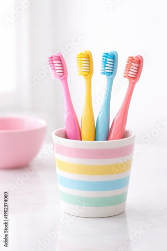 toothbrush, dental, hygiene, oral, care, colourful, cup, striped, light, background, clean, health, brush, bathroom, plastic, bristle, studio, isolated, object, nobody, freshness, daily, routine, family, personal, bright, vibrant, household, equipment, accessory, still, life, product, consumer, merchandise, prevention, healthy, lifestyle, pastel, interior, bowl, marble, table