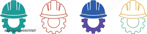 helmet, gear, construction, icon, safety, engineering, industry, mechanic, tool, work, protection, equipment, blue, red, yellow, green, colours, design, graphic, symbol, hard hat, safety-gear, illustration, shape, outline, drawing, flat, isolated