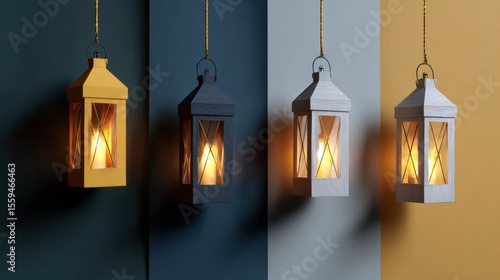 Four decorative lanterns with warm glowing lights hang against a multicolored background, creating a cozy and artistic ambiance.