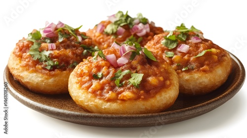 Four delicious savory Indian Dahi Puri snacks are artfully arranged on a dark brown plate against a pure white background.