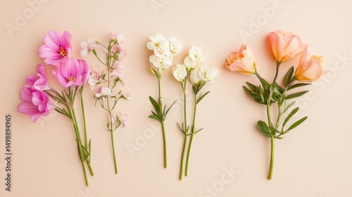 Four different types of flowers arranged in a row on a light pink background. on the left, there are six pink and white flowers with long stems and green leaves.