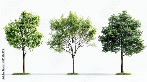 Four distinct trees featuring green leaves and different forms and sizes, set against a white background The image highlights hyperrealism with no shadows on the ground