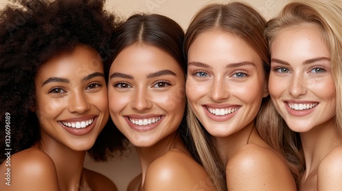 Four diverse, smiling women pose closely together, showcasing their natural beauty and confidence against a neutral background.