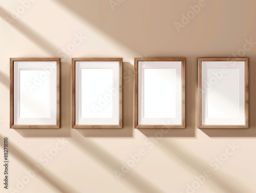 Four empty wooden frames hanging on beige colored wall. Picture frame mockup template background.