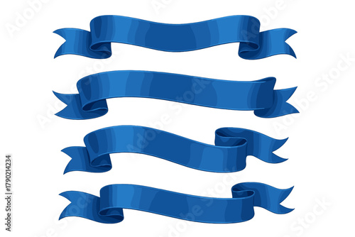 Four flowing blue ribbon banners and scrolls in different decorative shapes isolated on white