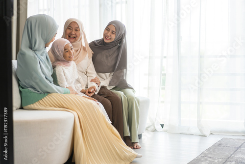 Four generations of muslim woman in hijab enjoying family time showing love, joy and happiness, grandmother, mother, daughters and granddaughter celebrating family traditions, togetherness and support