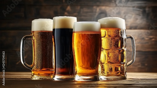 Four Glasses of Beer on Wooden Table, Warm and Inviting Ambiance, Perfect for Social Gatherings and Relaxation