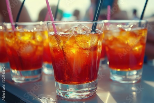 glasses, tea, straw, table, drink, beverage, ice, refreshment, container, liquid, sweet, summer, party, cold, hospitality, dining, fun, serving, clear, colours, shape, surface, round, group, collection, style, enjoyment, favor, garnish, citrous, cool, sip, taste, aroma, thirst, friends, leisure, setting, occasion, moment, life events