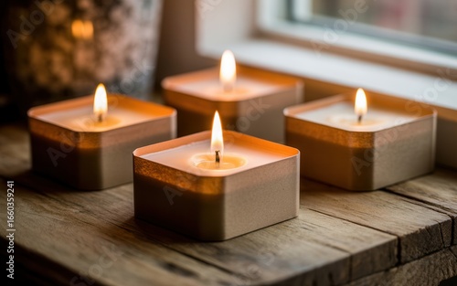 Four glowing candles create a warm, inviting ambiance on a rustic wooden surface, perfect for relaxation.