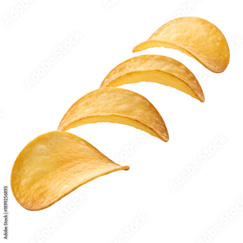 Four golden, crispy potato chips fanned out isolated on transparent background