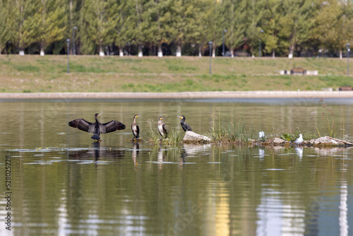 Four Great cormorants and Laridae in the shallows of the Ishim (or Esil) river. One of cormorants spreads his wings to dry them.