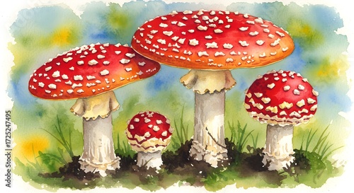 Four iconic fly agaric mushrooms with red caps and white spots on white stems against a colorful abstract background with grass, great for fairy tale books and nature art.